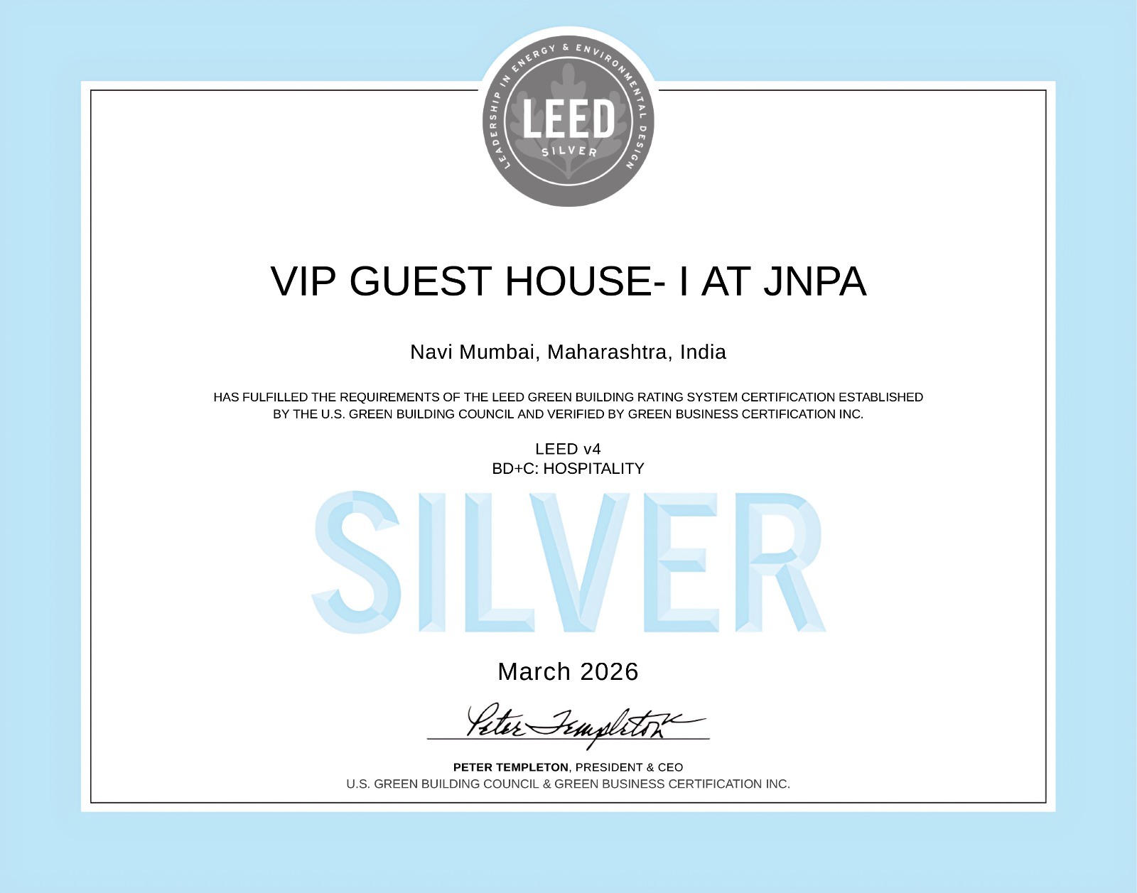 The VIP Guest House – I at Jawaharlal Nehru Port has been awarded the LEED Silver Certification by the U.S. Green Building Council.